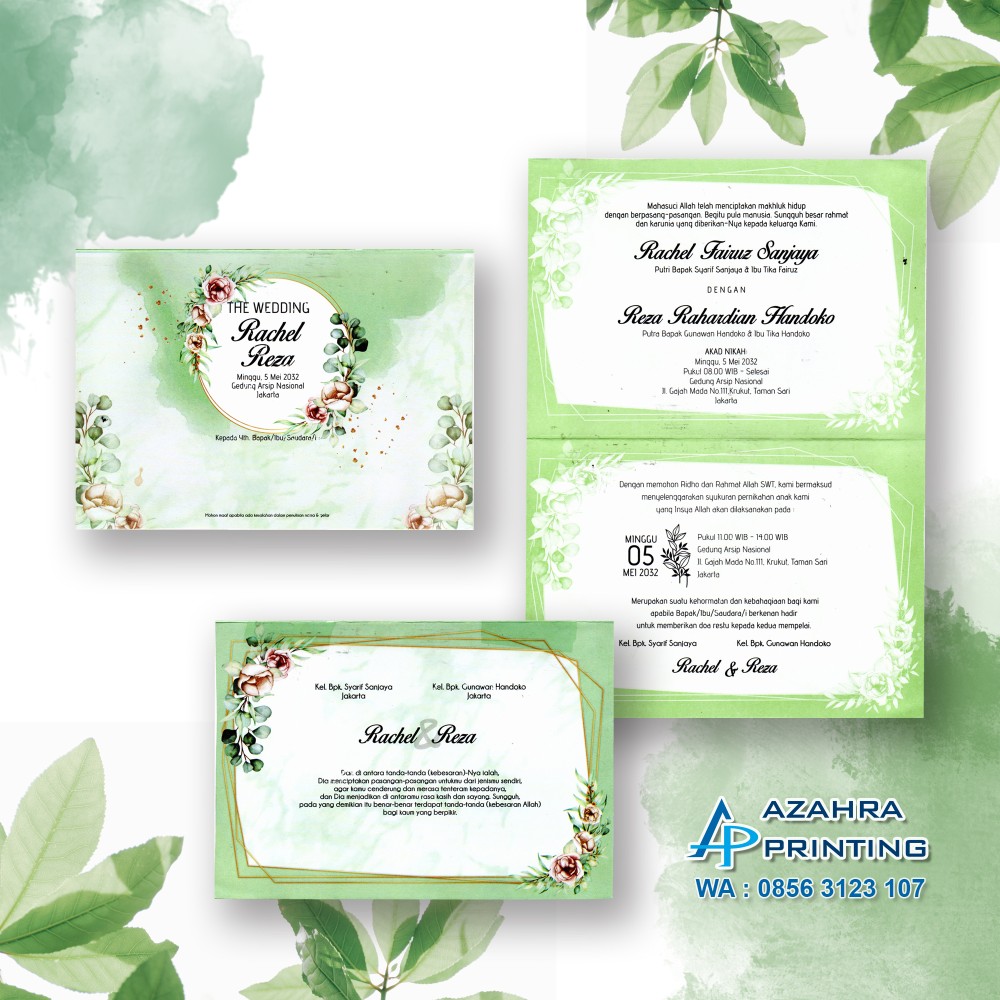 Keuntungan jika order di azahra_printing : ✨Pilihan undangannya banyak✨ Desain kekinian dan modis✨ Produknya berkualitas ✨ Packingnya aman✨ Pengirimannya cepat✨ Harga ramah dikantong ✨ Free revisi berkali-kali sampai fix✨ Free Foto (minimal order 300pcs) ✨ Free undangan website (minimal order 800pcs)✨ Free buku tamu (minimal order 300pcs)✨ Free cetak stiker label nama (minimal order 400pcs)✨ Undangan sudah terlipat rapi✨ Free denah lokasi dan barcode✨ Free Undangan Walimah 1 lembar HVS✨ Free plastik undangan ✨ Gratis Ongkir minimal order 800pcs se jatim