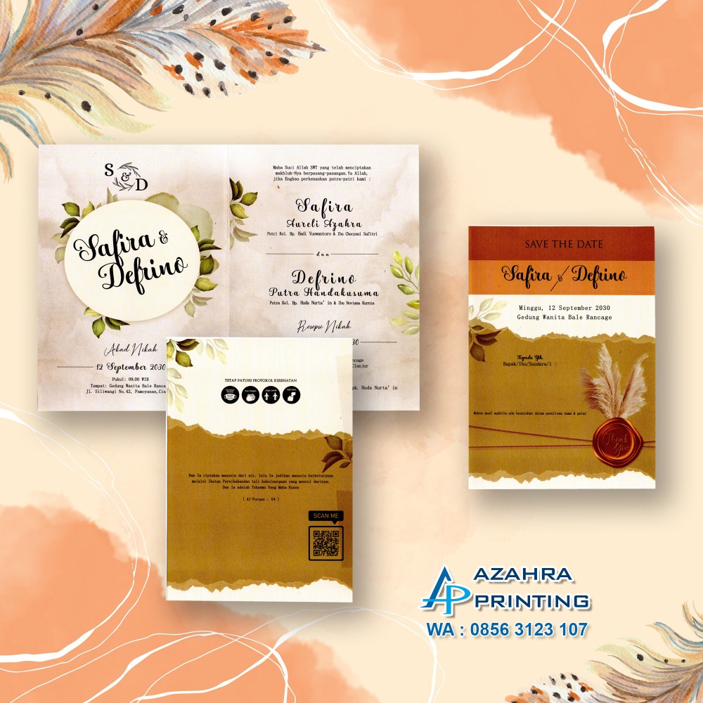 Keuntungan jika order di azahra_printing : ✨Pilihan undangannya banyak✨ Desain kekinian dan modis✨ Produknya berkualitas ✨ Packingnya aman✨ Pengirimannya cepat✨ Harga ramah dikantong ✨ Free revisi berkali-kali sampai fix✨ Free Foto (minimal order 300pcs) ✨ Free undangan website (minimal order 800pcs)✨ Free buku tamu (minimal order 300pcs)✨ Free cetak stiker label nama (minimal order 400pcs)✨ Undangan sudah terlipat rapi✨ Free denah lokasi dan barcode✨ Free Undangan Walimah 1 lembar HVS✨ Free plastik undangan ✨ Gratis Ongkir minimal order 800pcs se jatim