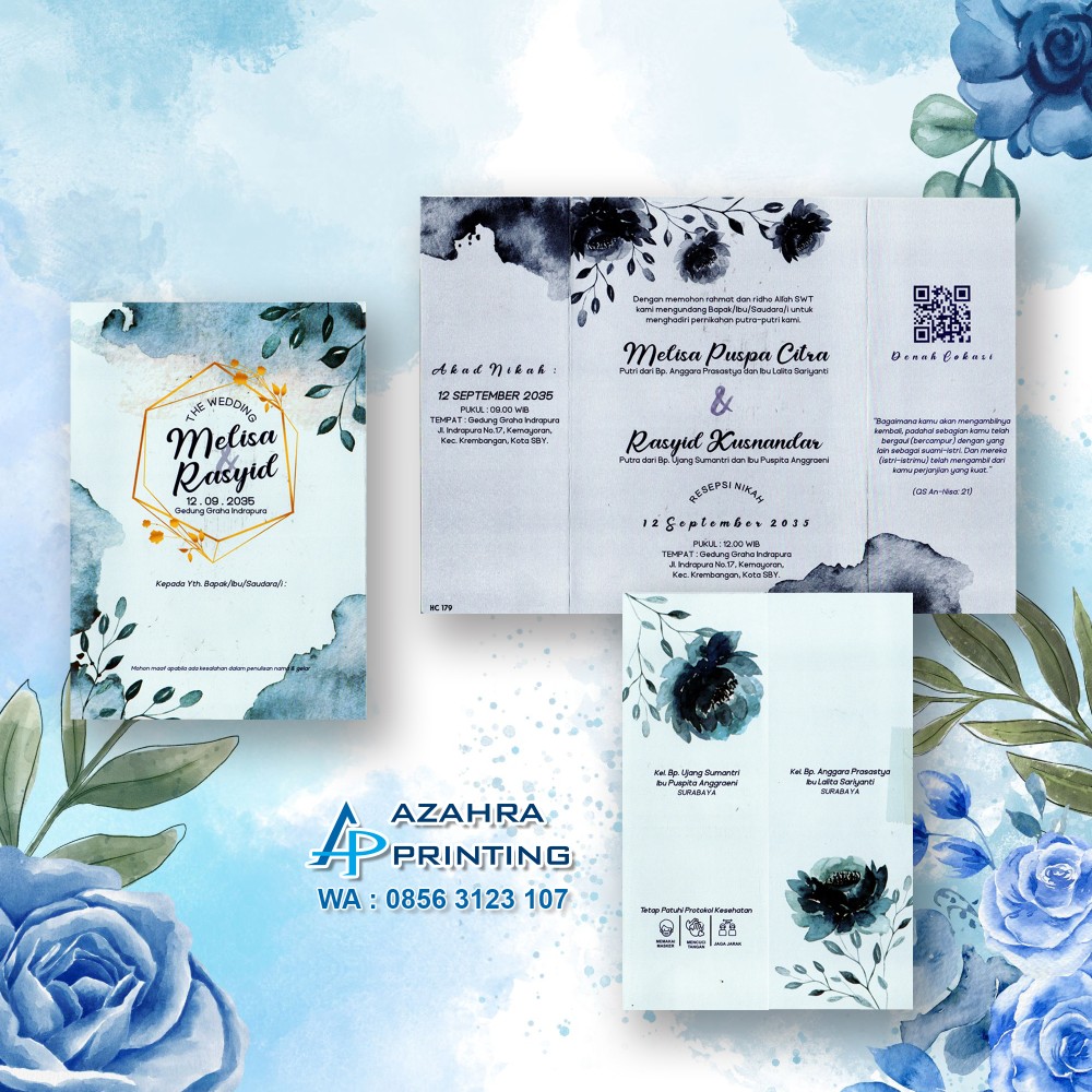 Keuntungan jika order di azahra_printing : ✨Pilihan undangannya banyak✨ Desain kekinian dan modis✨ Produknya berkualitas ✨ Packingnya aman✨ Pengirimannya cepat✨ Harga ramah dikantong ✨ Free revisi berkali-kali sampai fix✨ Free Foto (minimal order 300pcs) ✨ Free undangan website (minimal order 800pcs)✨ Free buku tamu (minimal order 300pcs)✨ Free cetak stiker label nama (minimal order 400pcs)✨ Undangan sudah terlipat rapi✨ Free denah lokasi dan barcode✨ Free Undangan Walimah 1 lembar HVS✨ Free plastik undangan ✨ Gratis Ongkir minimal order 800pcs se jatim