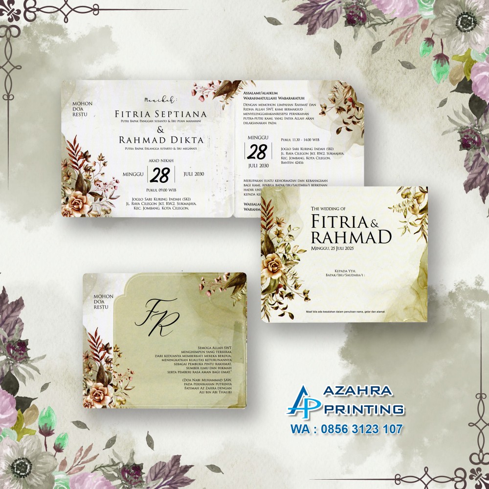 Keuntungan jika order di azahra_printing : ✨Pilihan undangannya banyak✨ Desain kekinian dan modis✨ Produknya berkualitas ✨ Packingnya aman✨ Pengirimannya cepat✨ Harga ramah dikantong ✨ Free revisi berkali-kali sampai fix✨ Free Foto (minimal order 300pcs) ✨ Free undangan website (minimal order 800pcs)✨ Free buku tamu (minimal order 300pcs)✨ Free cetak stiker label nama (minimal order 400pcs)✨ Undangan sudah terlipat rapi✨ Free denah lokasi dan barcode✨ Free Undangan Walimah 1 lembar HVS✨ Free plastik undangan ✨ Gratis Ongkir minimal order 800pcs se jatim