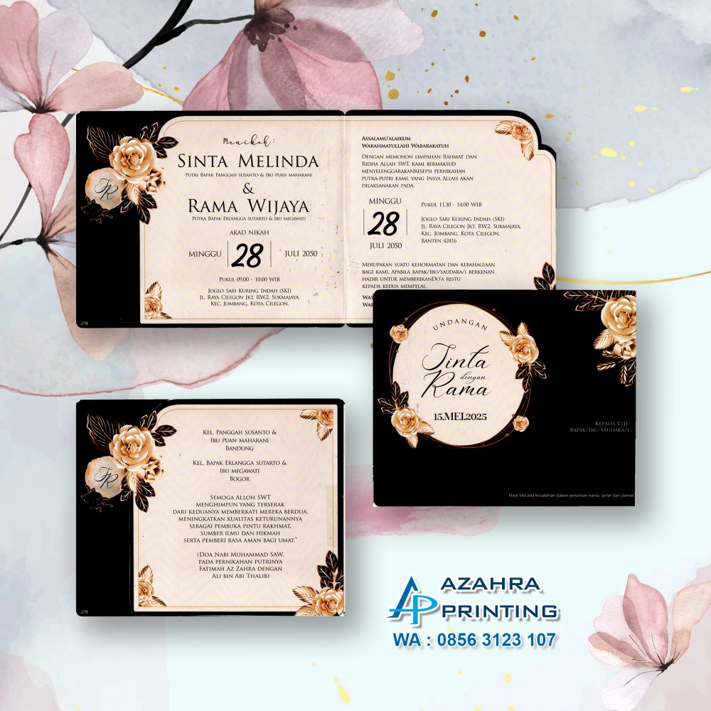 Keuntungan jika order di azahra_printing : ✨Pilihan undangannya banyak✨ Desain kekinian dan modis✨ Produknya berkualitas ✨ Packingnya aman✨ Pengirimannya cepat✨ Harga ramah dikantong ✨ Free revisi berkali-kali sampai fix✨ Free Foto (minimal order 300pcs) ✨ Free undangan website (minimal order 800pcs)✨ Free buku tamu (minimal order 300pcs)✨ Free cetak stiker label nama (minimal order 400pcs)✨ Undangan sudah terlipat rapi✨ Free denah lokasi dan barcode✨ Free Undangan Walimah 1 lembar HVS✨ Free plastik undangan ✨ Gratis Ongkir minimal order 800pcs se jatim